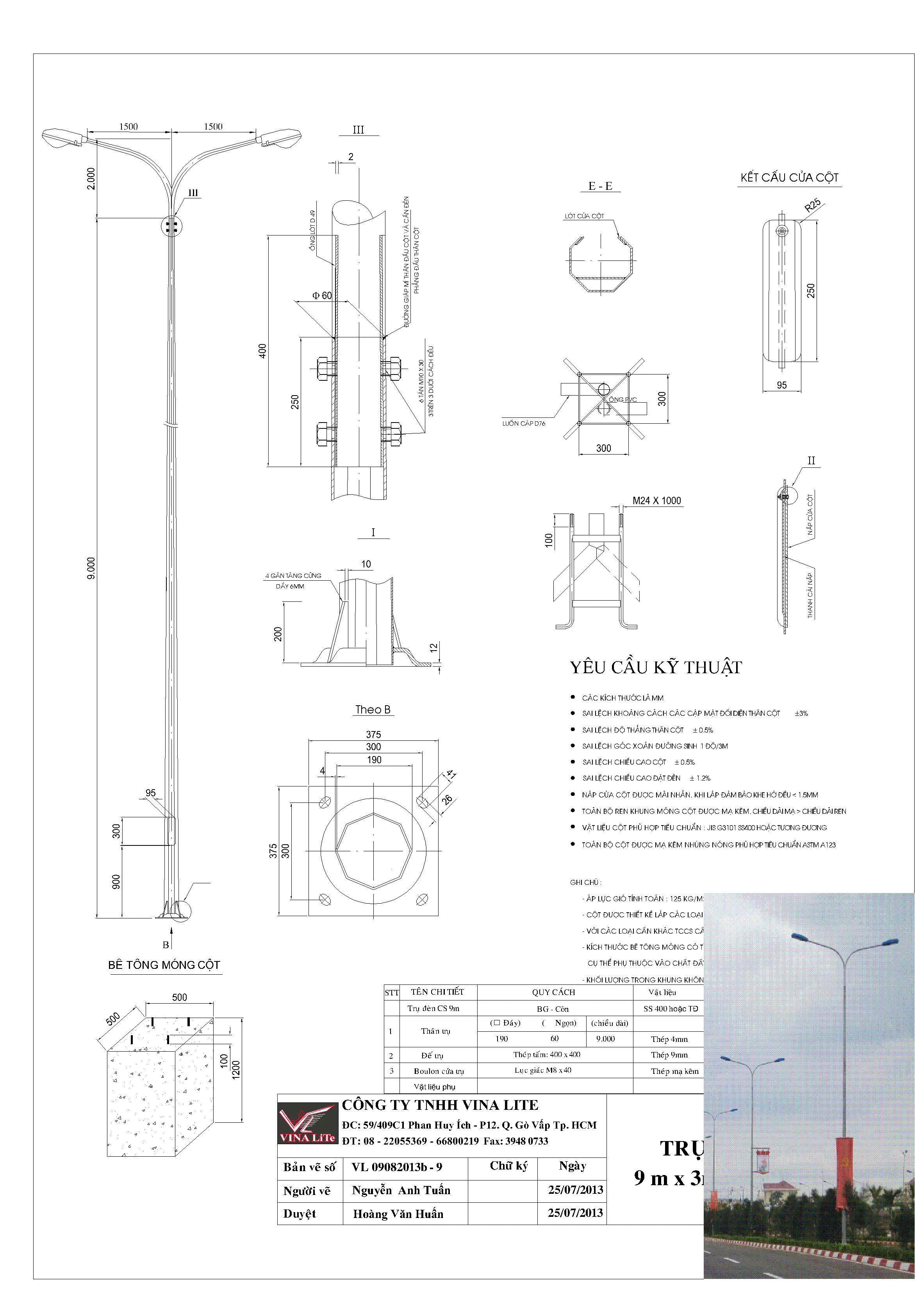 * Trụ đèn chiếu sáng theo tiêu chuẩn của VINA LiTe được thiết kế chịu sức gió 45m/s tương đương vận tốc gió 160Km/h.