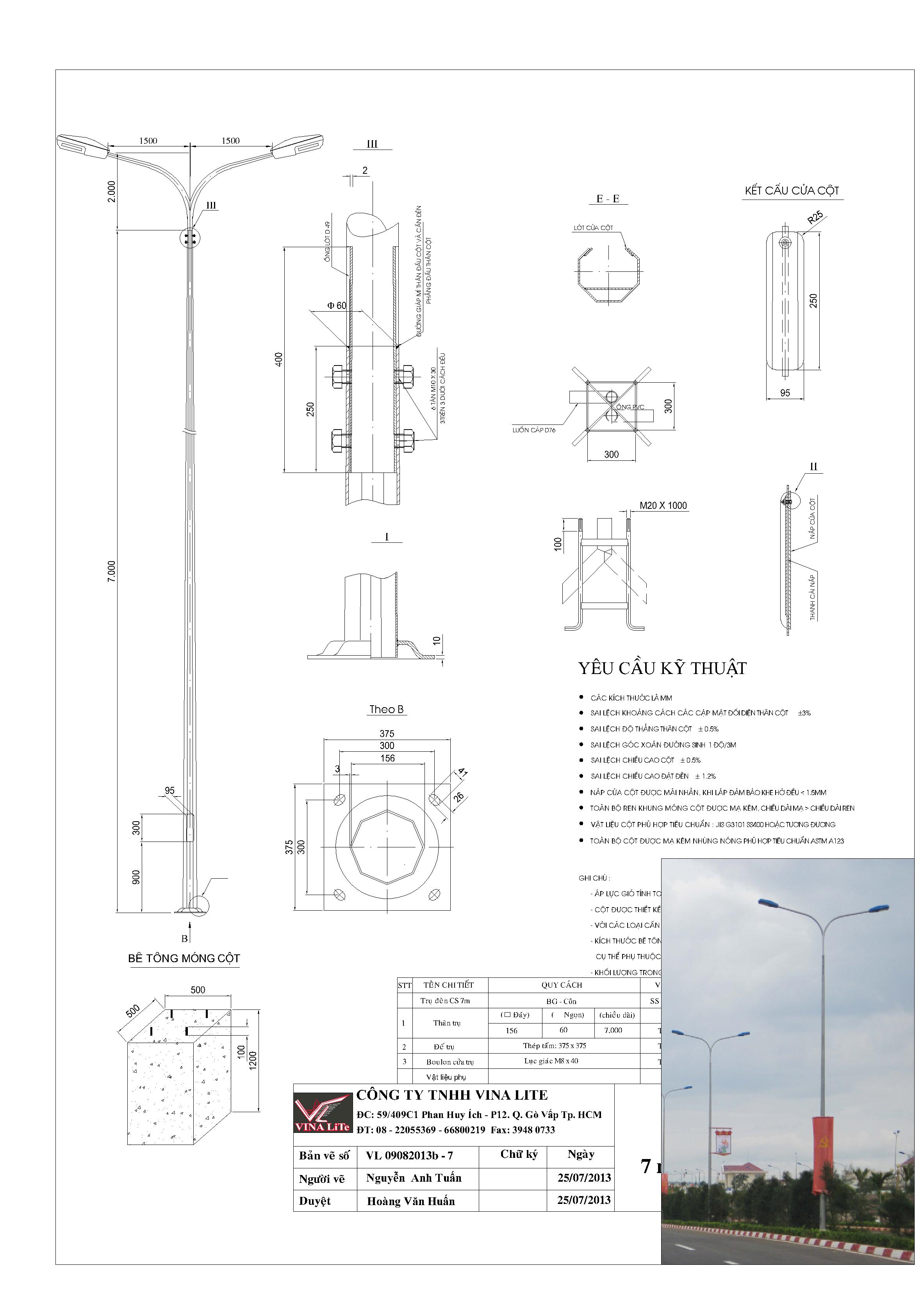 * Trụ đèn chiếu sáng theo tiêu chuẩn của VINA LiTe được thiết kế chịu sức gió 45m/s hệ số gió giật 1,3.