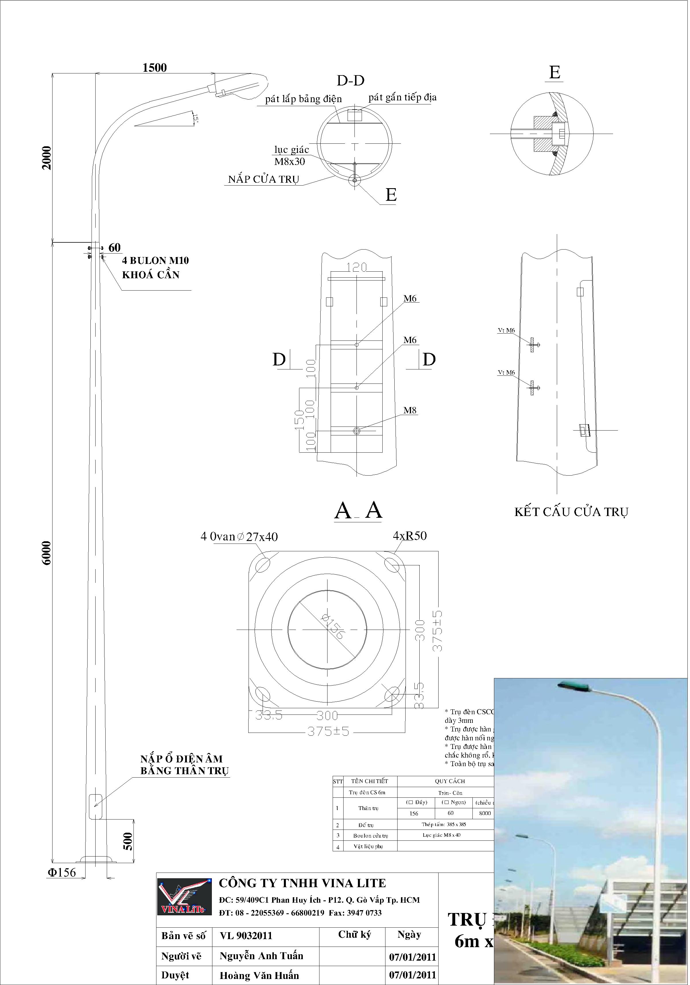 * Trụ đèn chiếu sáng theo tiêu chuẩn của VINA LiTe được thiết kế chịu sức gió 45m/s hệ số gió giật 1,3.