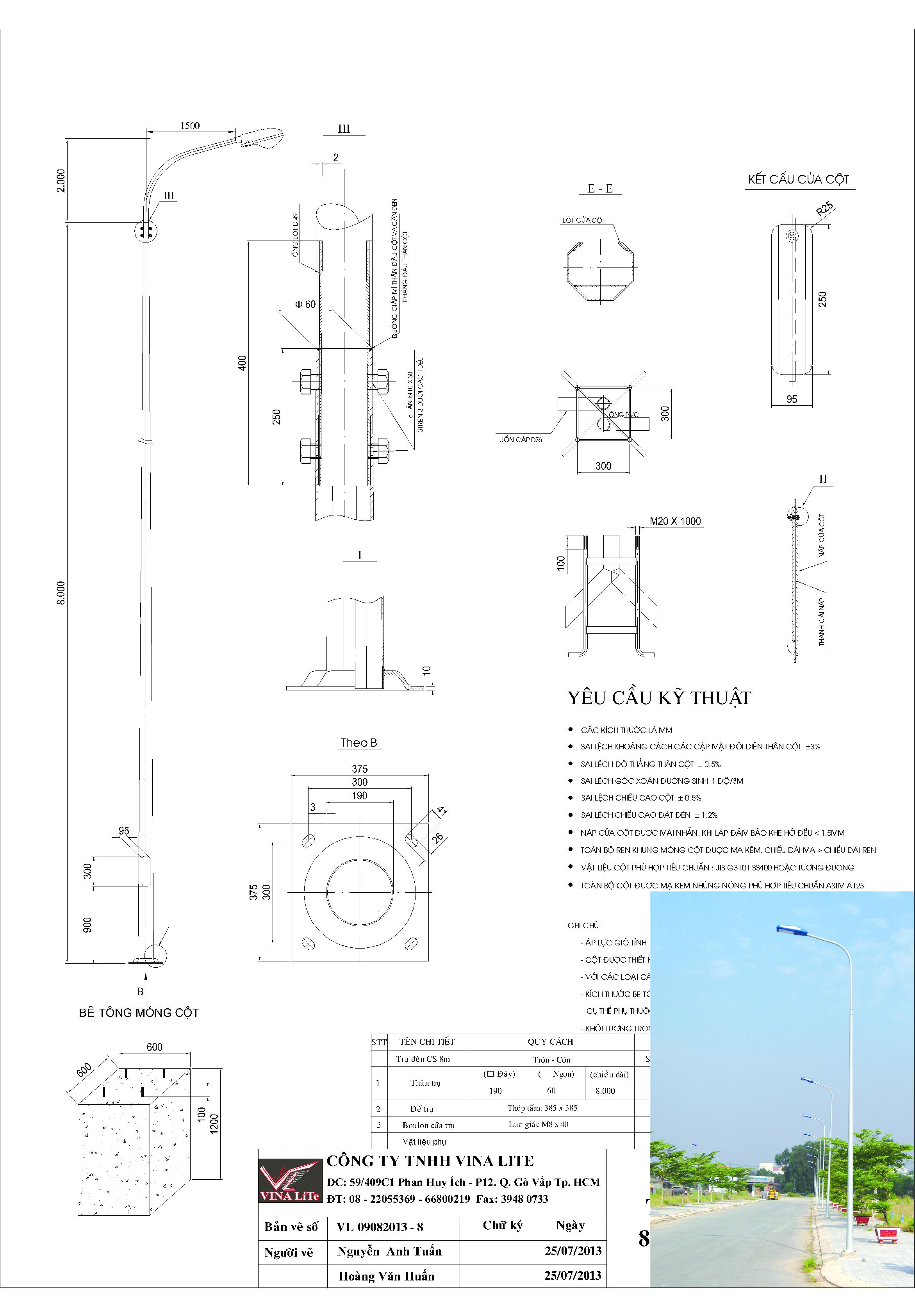 * Trụ đèn chiếu sáng theo tiêu chuẩn của VINA LiTe được thiết kế chịu sức gió 45m/s tương đương vận tốc gió 160Km/h.